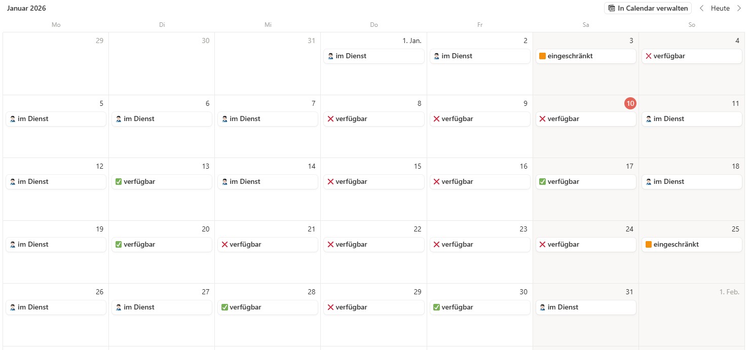 Trage ein wann du verfügbar, eingeschränkt verfügbar oder nicht verfügbar bist. Deine Dienste musst du nicht extra eintragen, diese werden automatisch übertragen. Die Default-Einstellung ist nicht verfügbar – du musst also nur einstellen, wann du wirklich Kapazitäten hast.